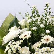 This handtied bouquet consists of seasonal white and green flowers and foliage, gift wrapped and presented in a stylish bag.