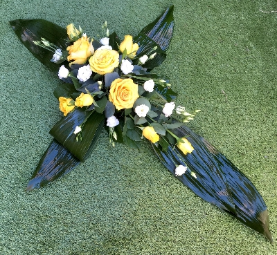 A modern cross design of lemon roses and aspidistra leave to create this contemporary styled cross.